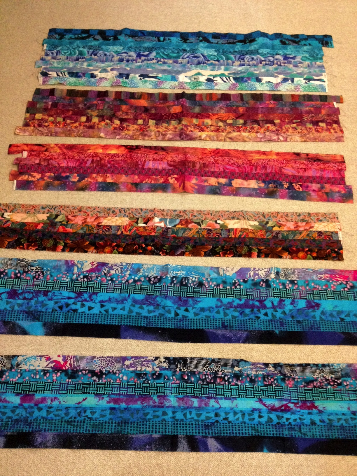 I was recently given some left over fabric pieces from former projects of a fellow quilter. She admitted that some of the fabric has been put away in her basement for up to 15 years. Although some of the fabric colors were rather dated, some of them were bright and cheerful. I picked out some of the fabric strips that I liked best.