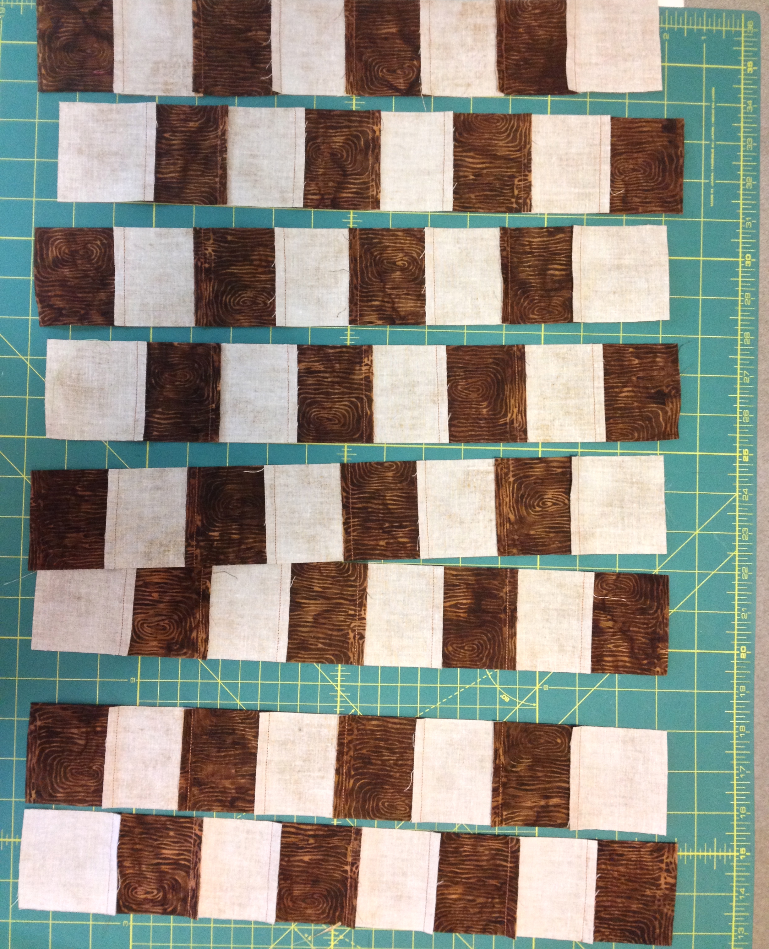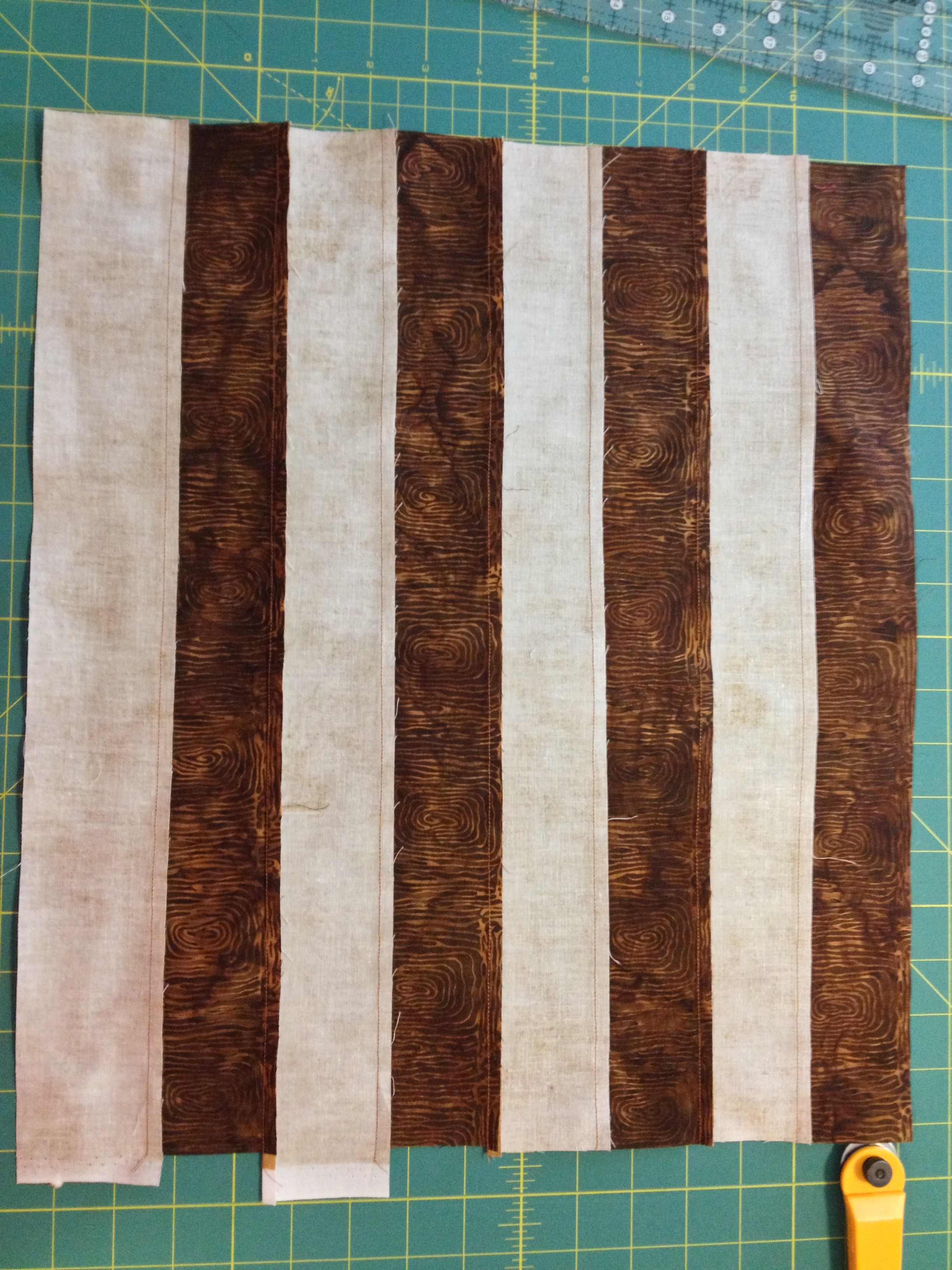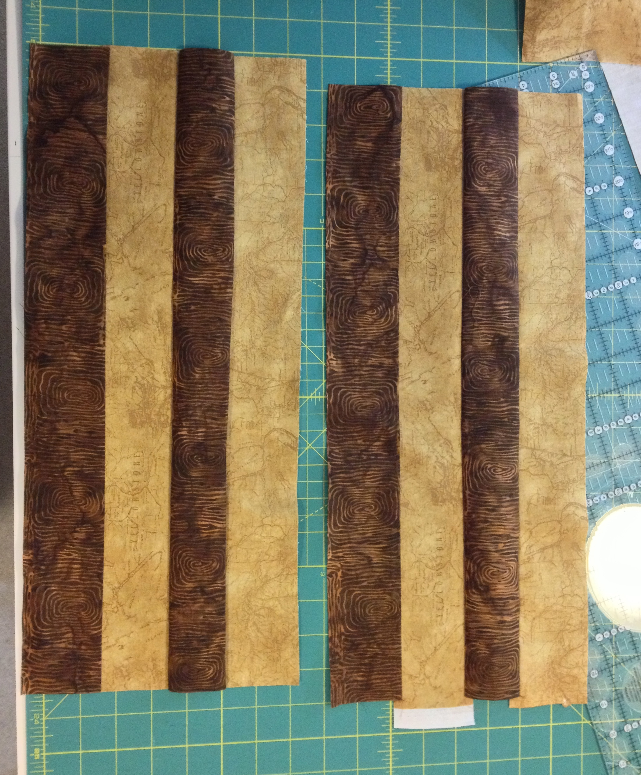 I picked out 2 fabrics that I thought he’d like. One was a dark brown wood grain fabric and the other was a national park map fabric. I cut it into 2 1/2″ strips and started sewing.