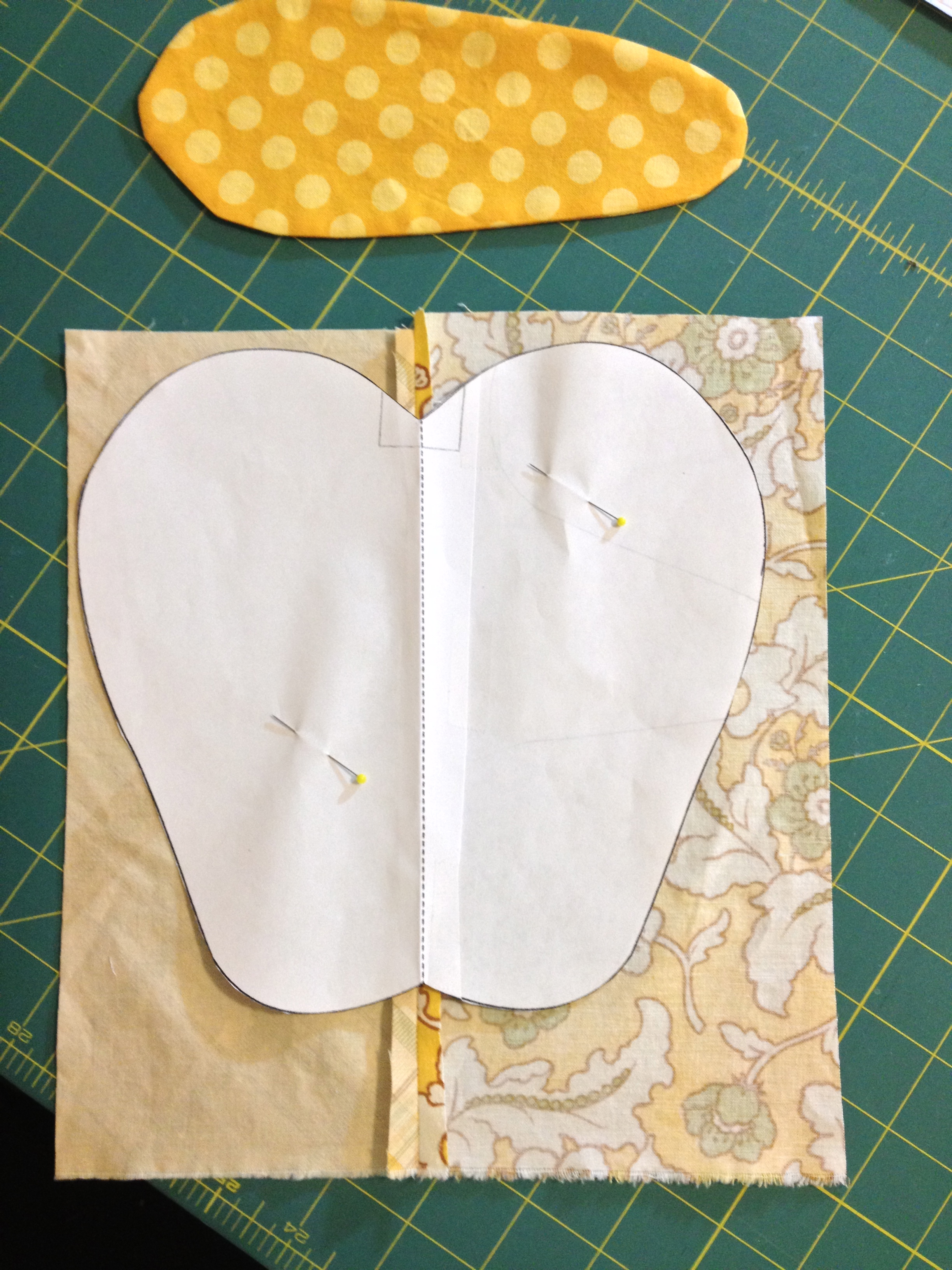 Next is to sew the two other fabrics together with a straight seam, press seam open and place the pattern on top with the seam down the middle.