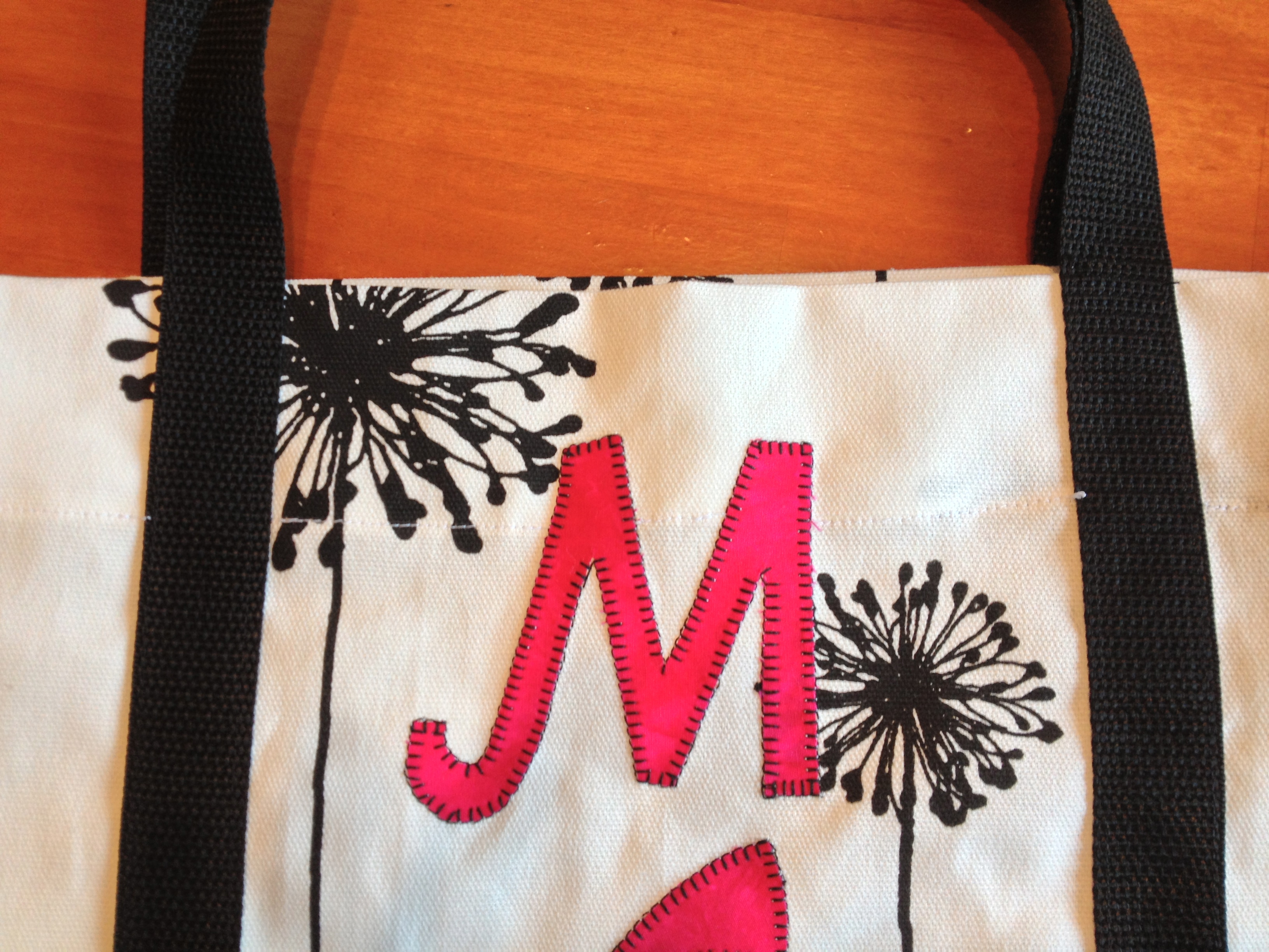 I used a blanket stitch in black thread to stitch around the letters. I did this on all of the bags for it to coordinate with the black 1 inch webbing I’m using for the handles.