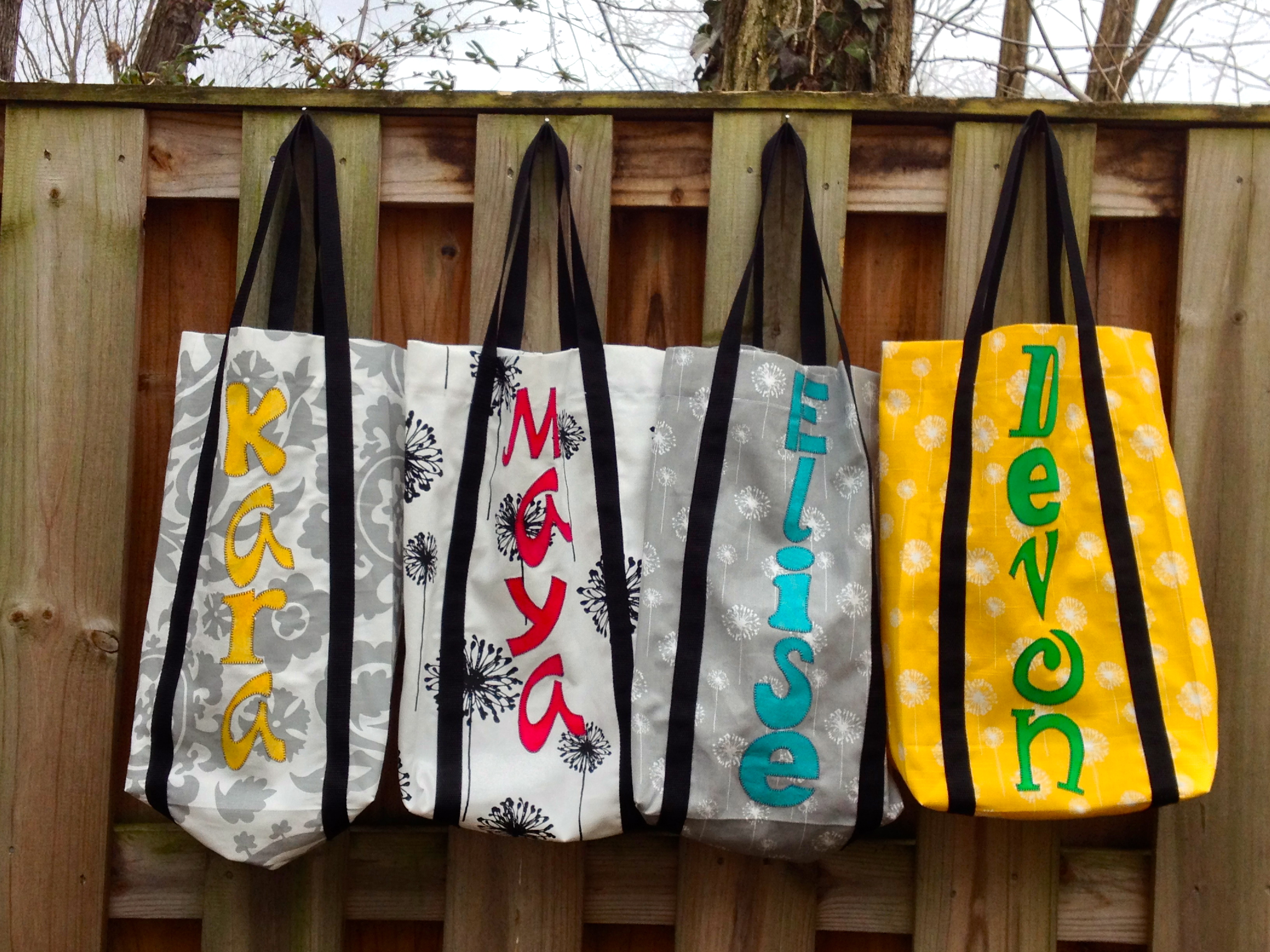 I had these decor weight fabrics I had mail ordered some time ago, thinking they were quilting cottons. These are perfect for an unlined bag! I wanted to put the girls names on the front of the totes and had this booklet by Atkinson Designs. (now out of print)