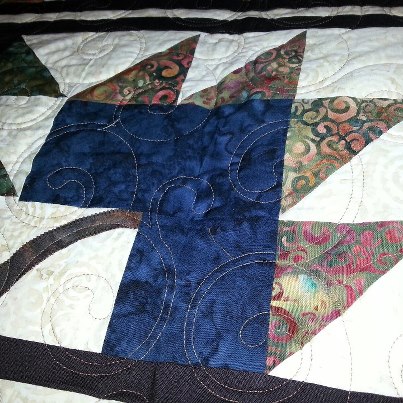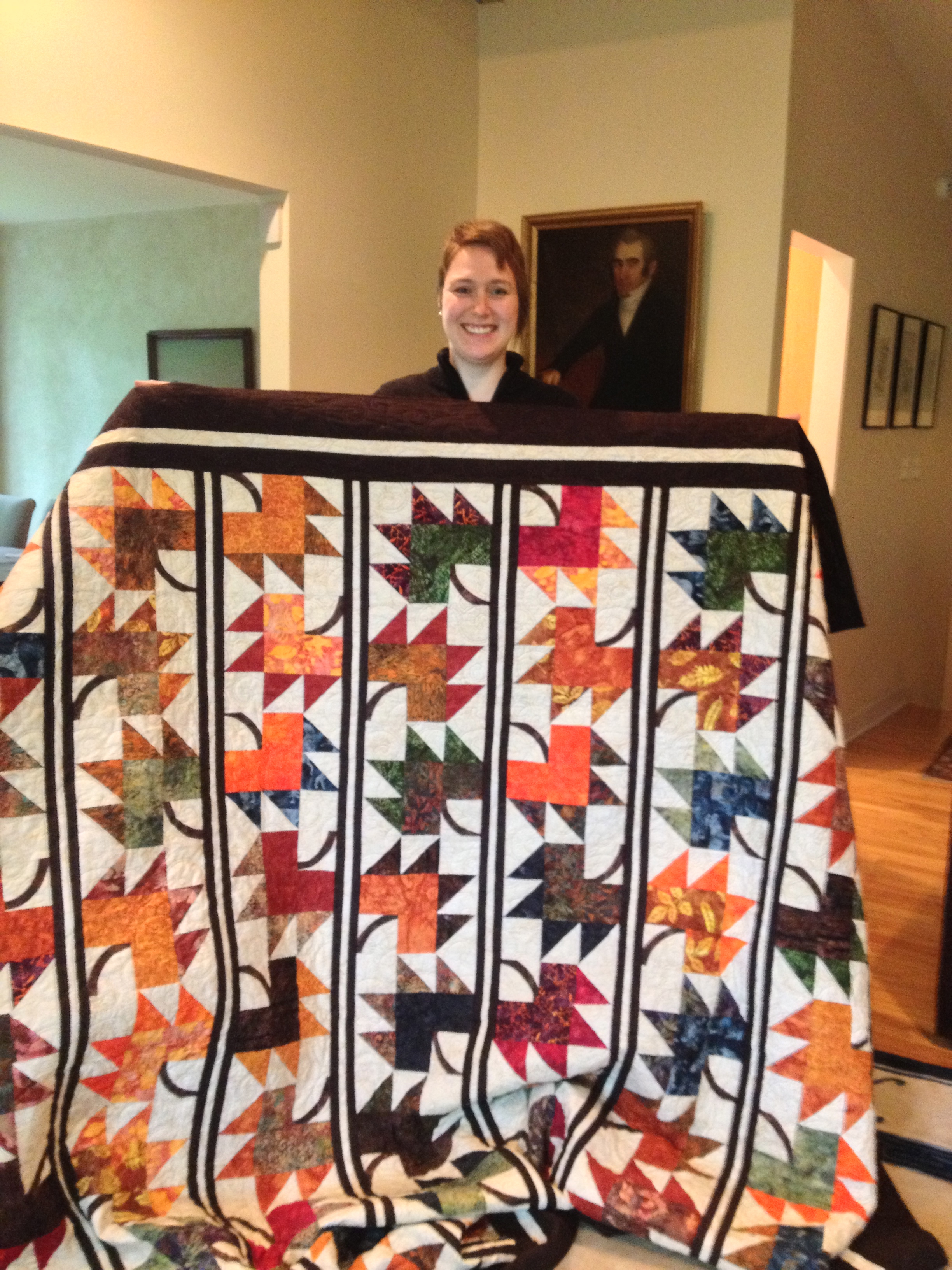 I got the quilt top done at the retreat but didn’t have any backing fabric so the final backing, quilting and binding was done at home.
