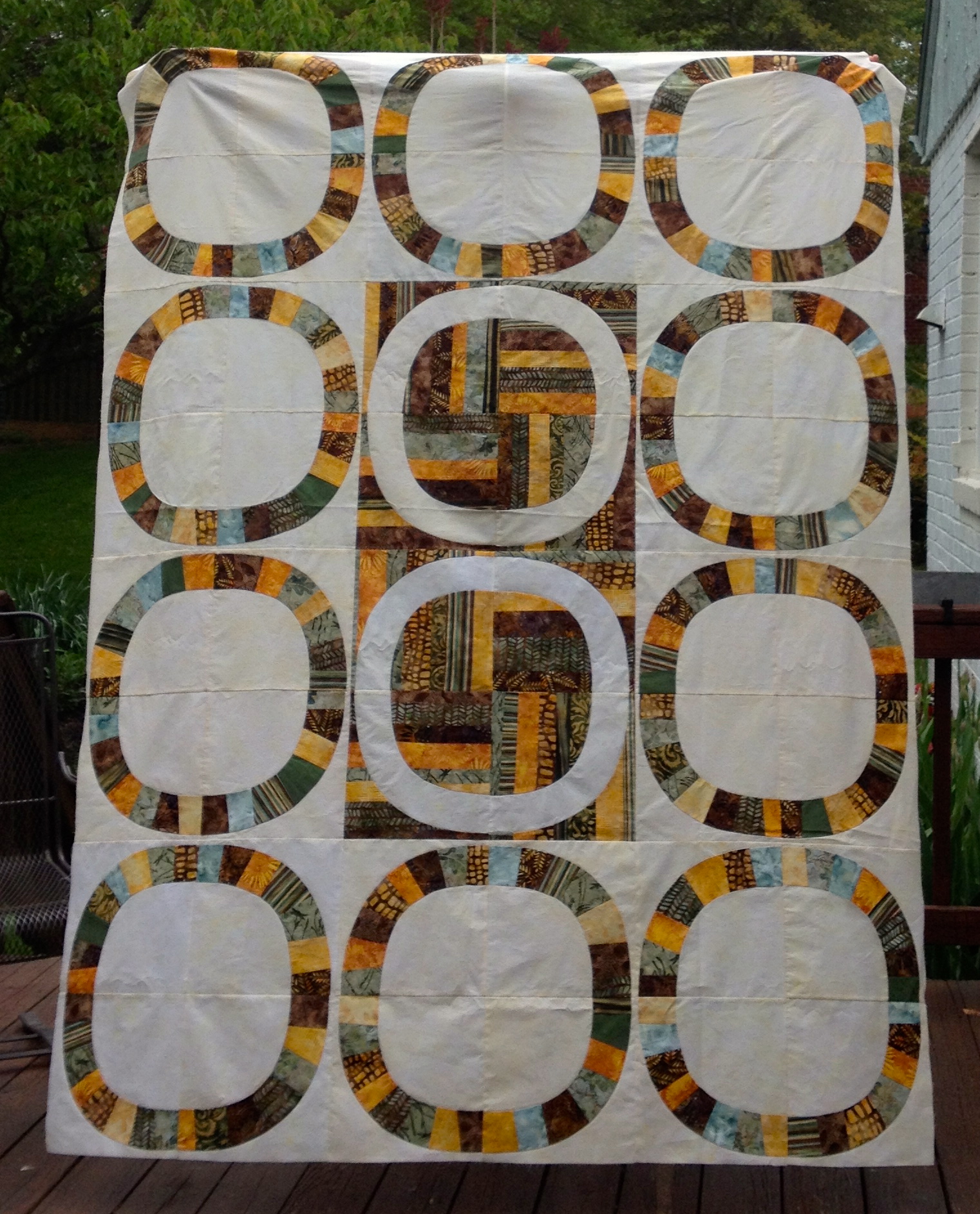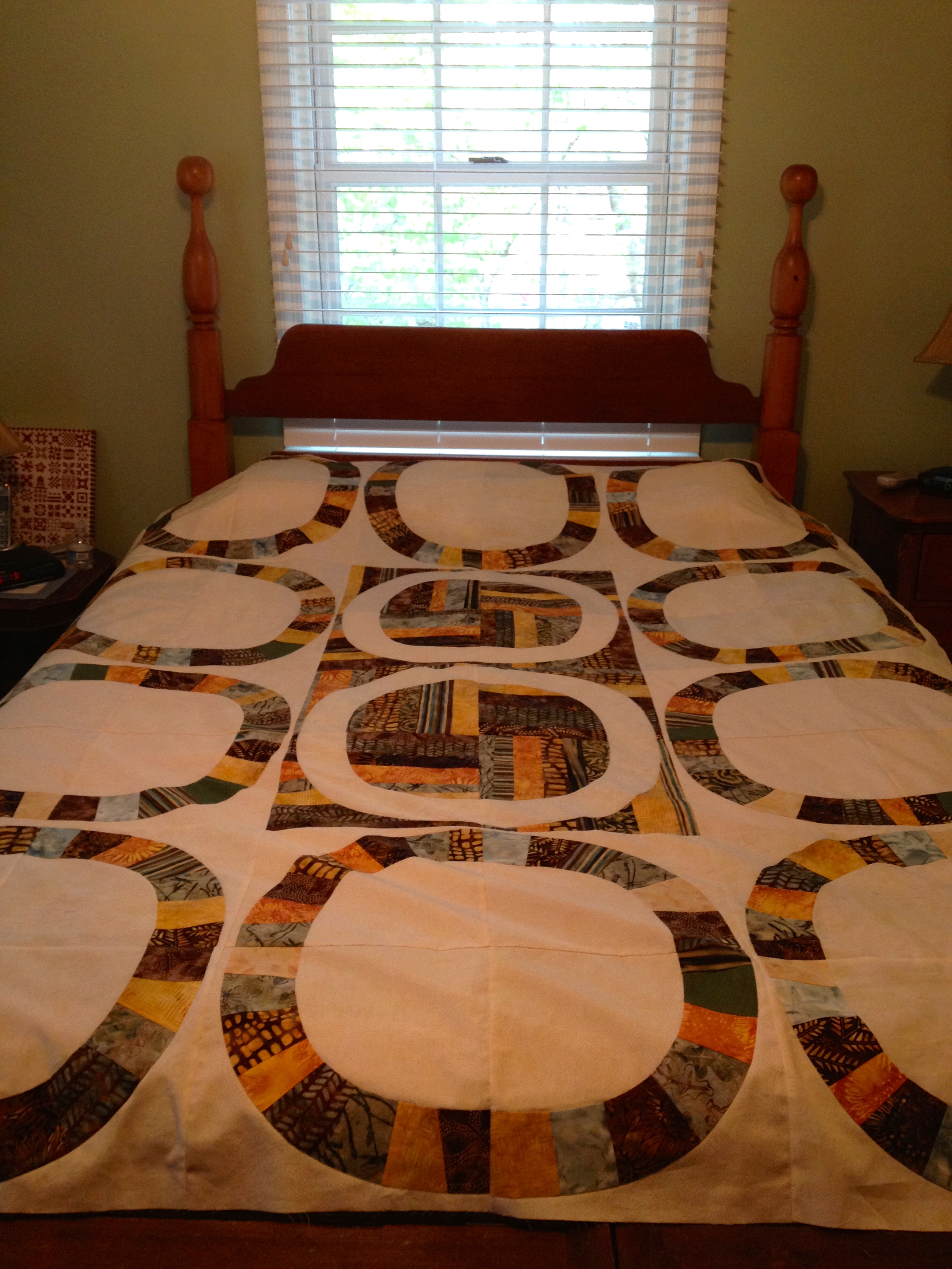 It was a breeze to sew the 12 large circle blocks together once these middle two were together. I’m really happy with the result. Here is how it looks laid out on my queen size bed – it’s only meant to be a lap quilt, but a big one!