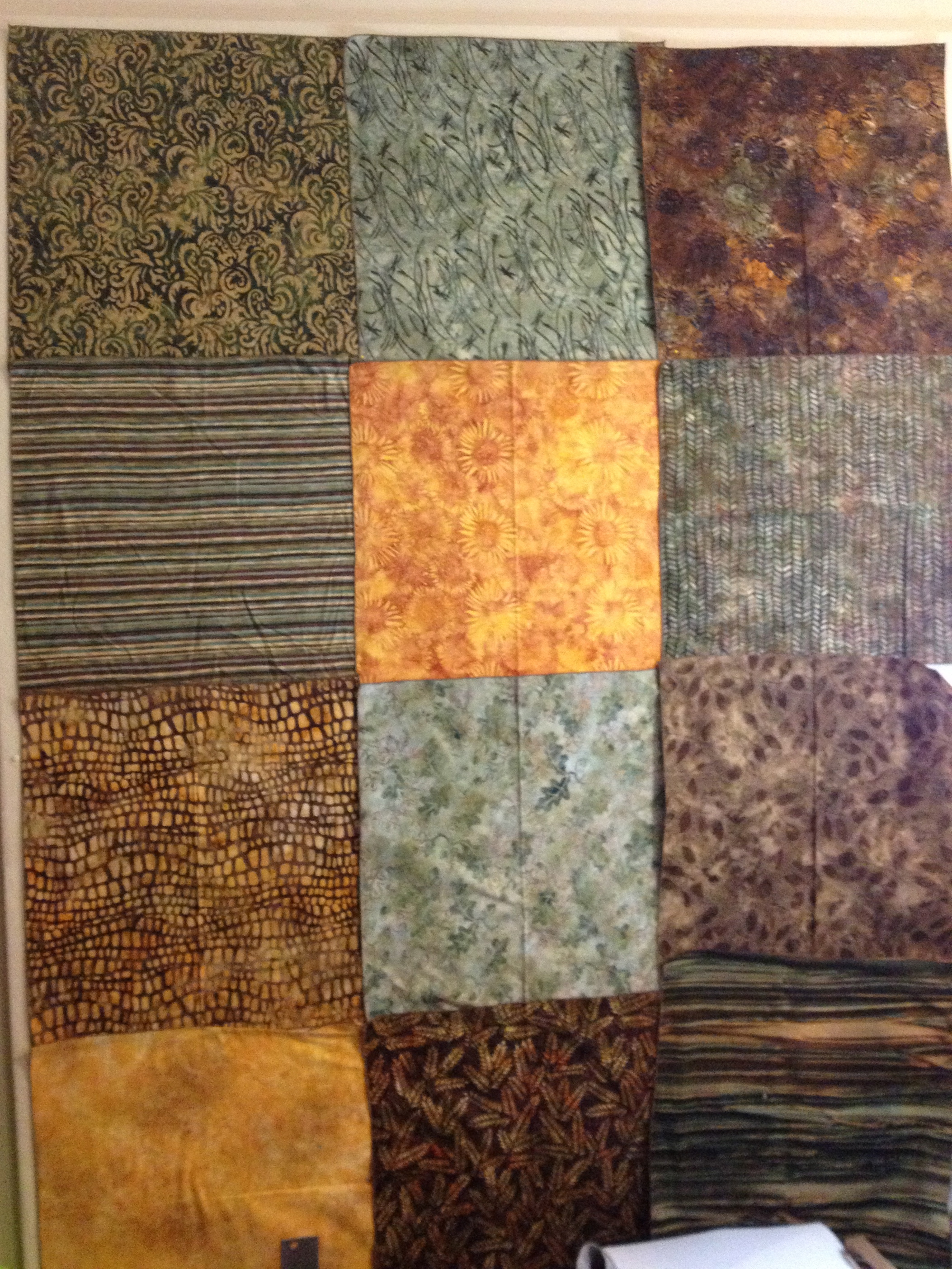 I took this picture of their quilt because I liked the easy wavy quilting that was done on it. (Are you catching on to what was important to me?) I chose fat quarters and took them home, washed them and cut them into 3″ squares.