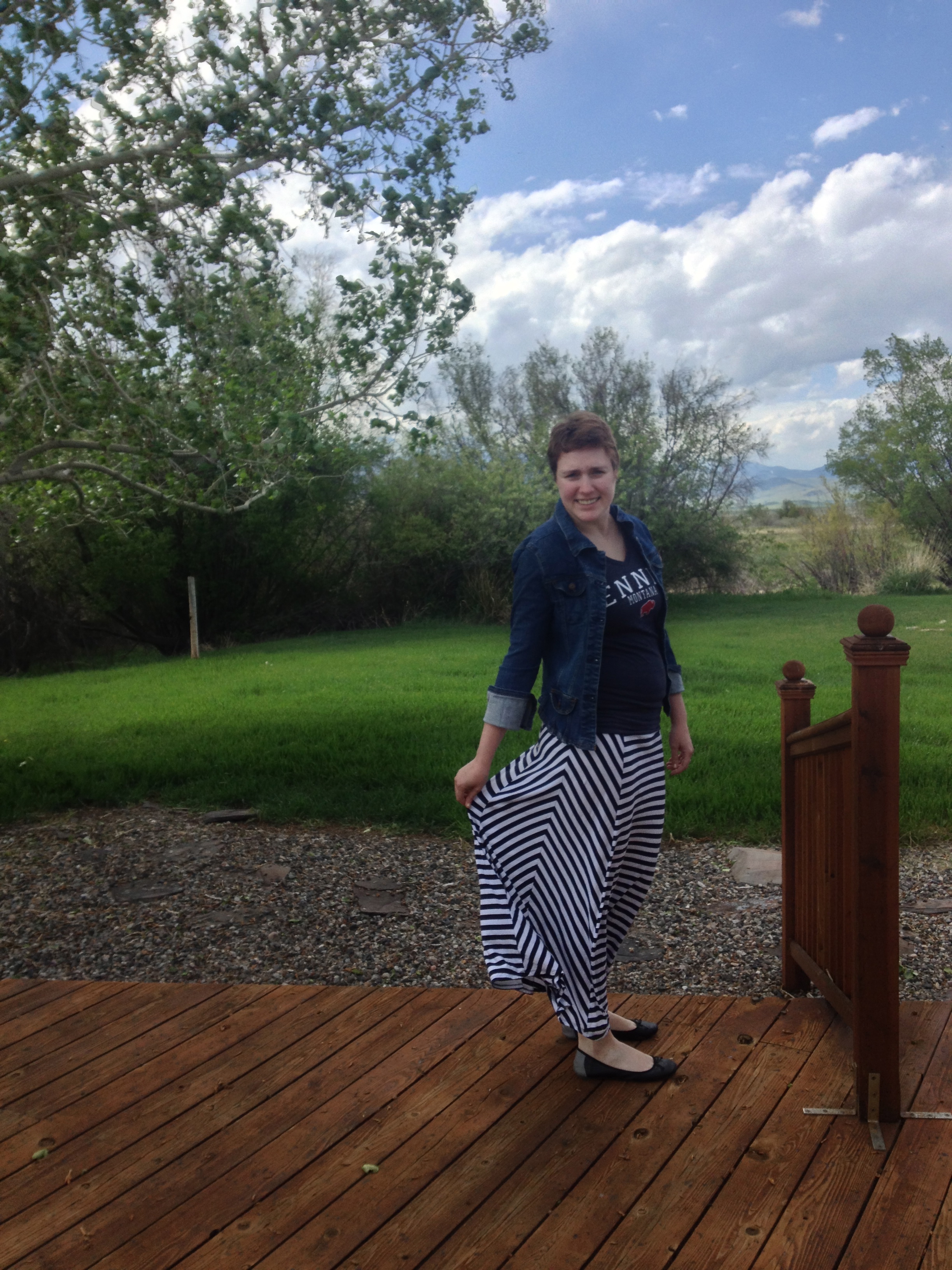 A week later I met my oldest daughter, Lindsey, in Montana and she had a knit maxi skirt that she had bought last summer and some fabric that she wanted to use to try to replicate it. Here is the original skirt on her.