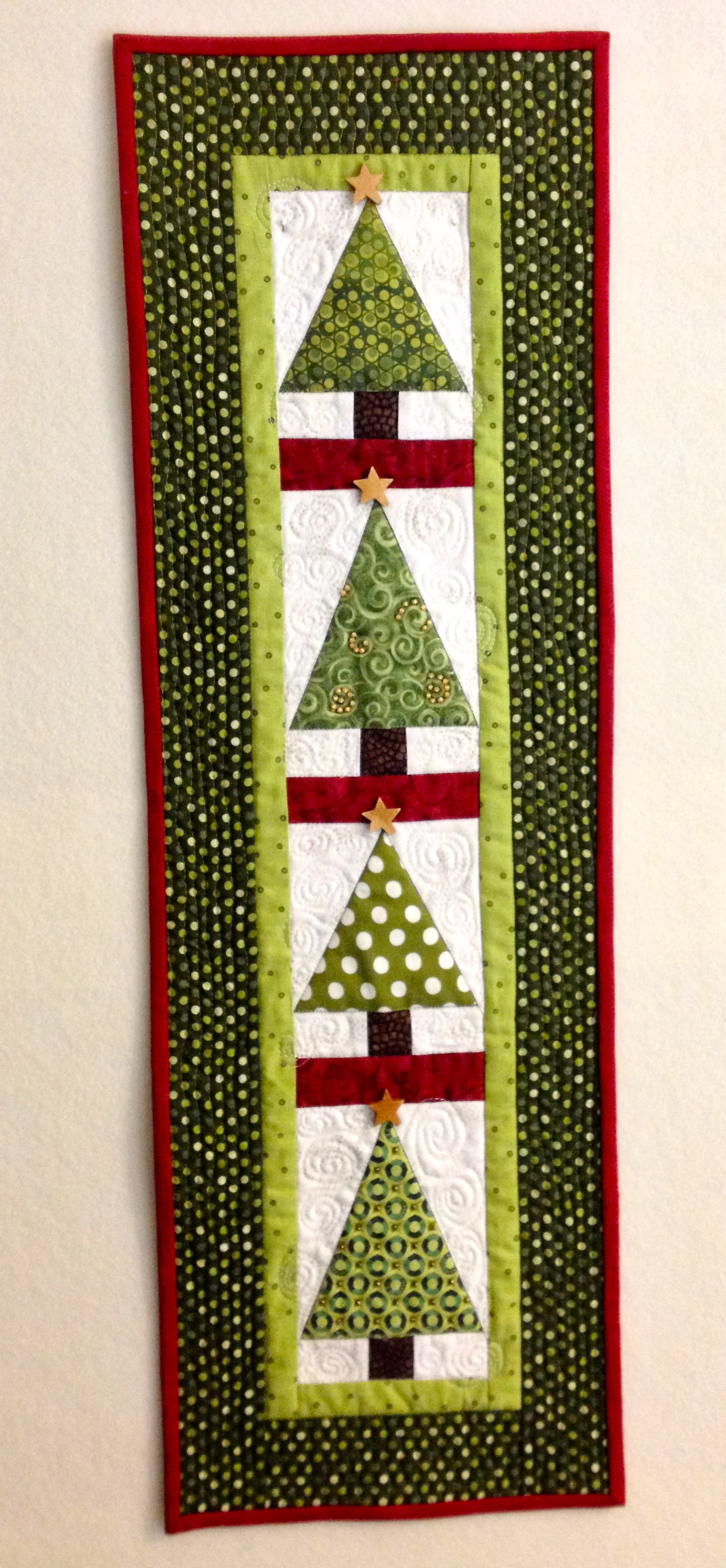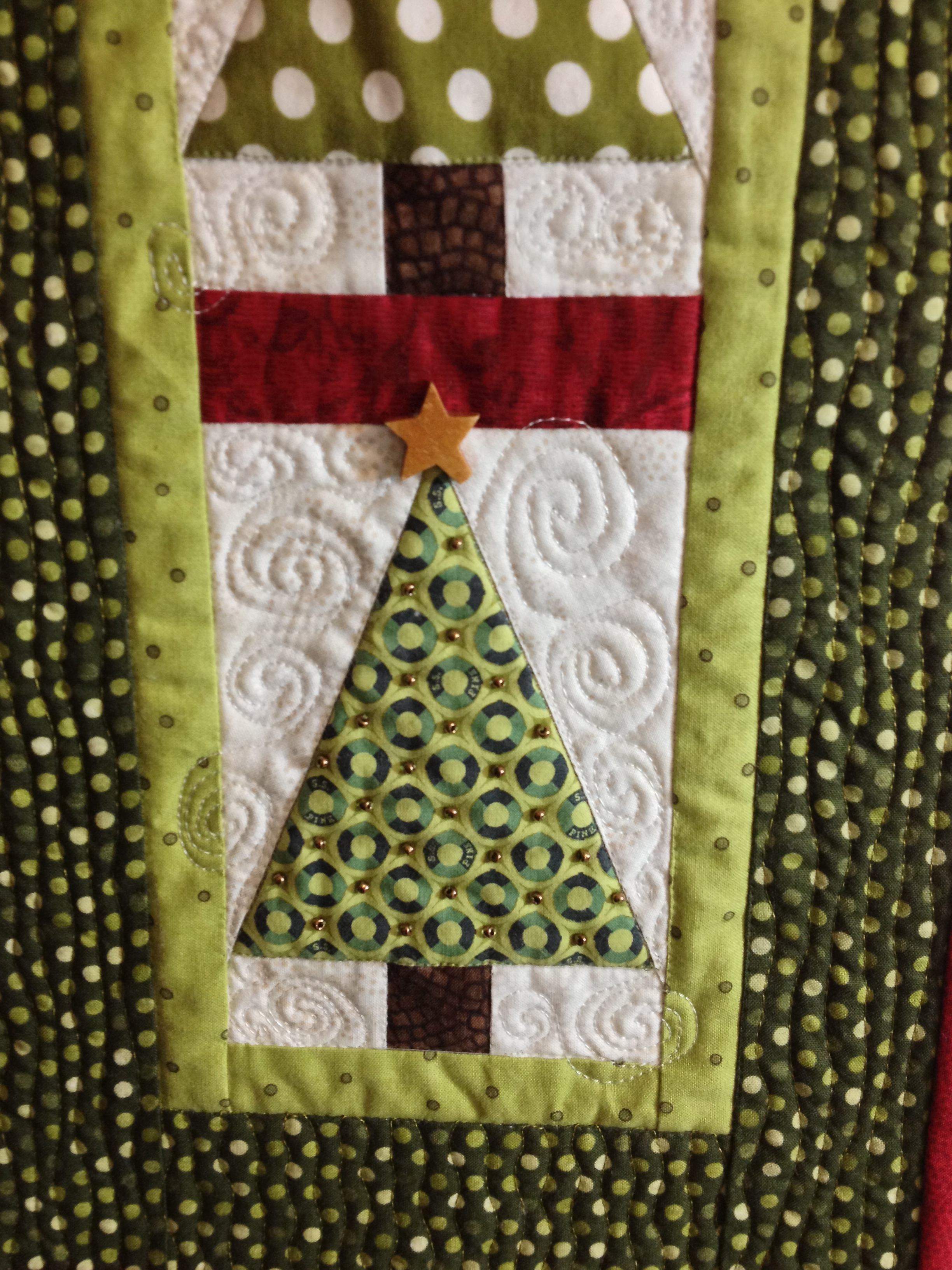 Everything sort of fell in place after that. A piece of Pellon Peltex (really stiff interfacing) forms the core of the card. I used Wonder Under to fuse the pieces to the card. I also had to interface the white building pieces to avoid having the blue of the sky or the red of the brick walk show through. Sewing themed fabric was incorporated just for fun. I debated about free motion stitching the “Happy Anniversary” at the top. I knew it would look messy. In the end, though, I decided to go ahead and do it. It is a hand-made card after all!