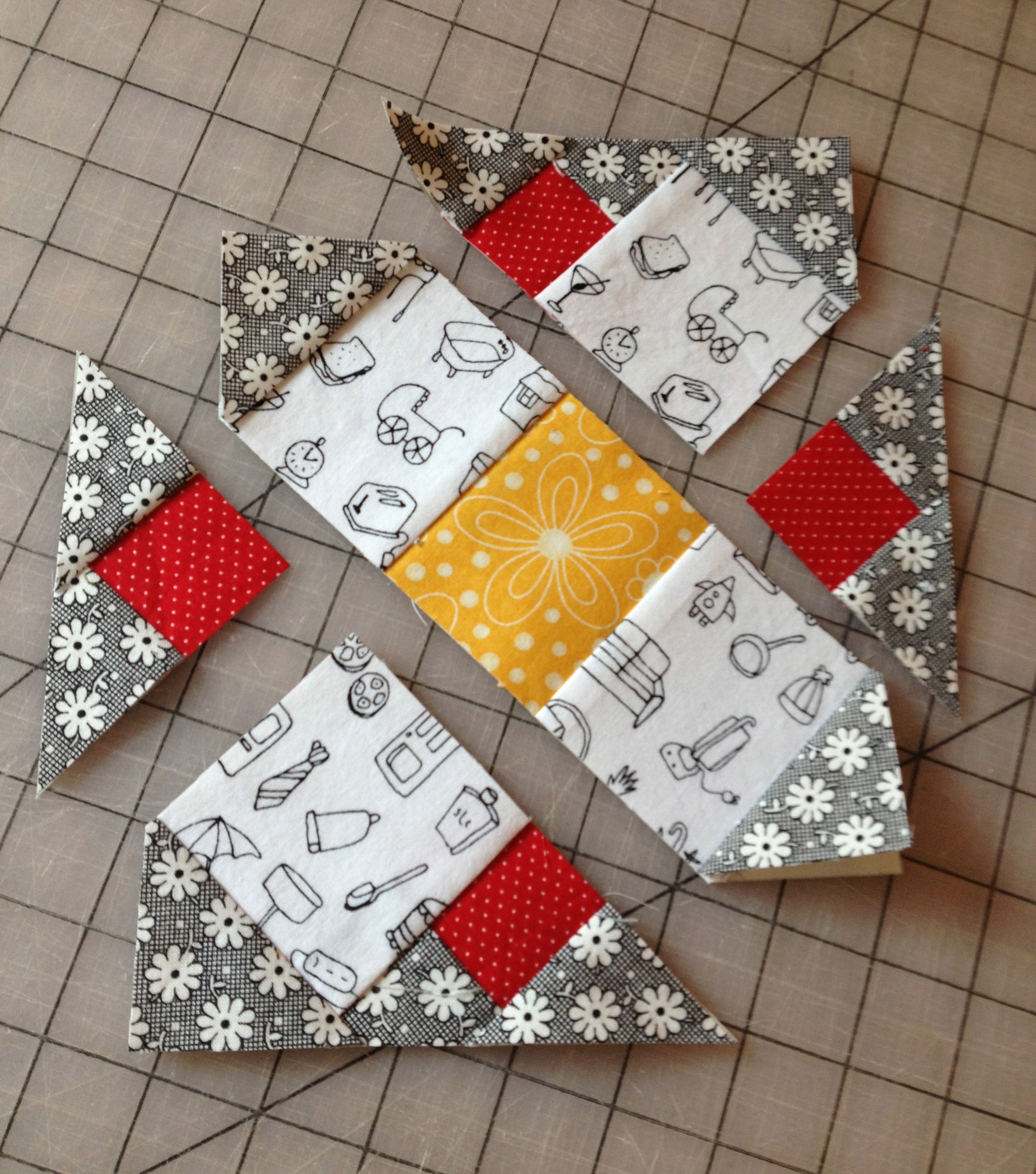 The book comes with templates for these little patchwork squares and triangles and suggests you position them on your fabric and cut around them. This already seemed too fussy for me but I gave it a try.  Basically I turned a perfectly good piece of fabric into this: